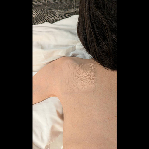 胸元が開いている服は傷跡が見えてしまうため欲しい服があっても諦めていましたが、好きな服が買えるようになり人生変わりました。肌が弱いですが、貼りっぱなしでも肌荒れしないので安心しています。丸型1つでは少し小さいので2枚貼っていますがいい感じです。(20代 女性 色白肌)